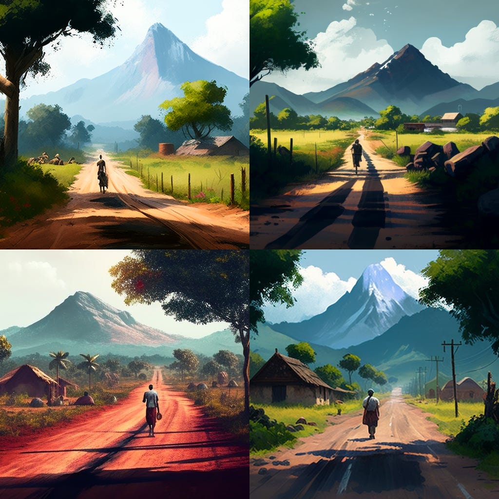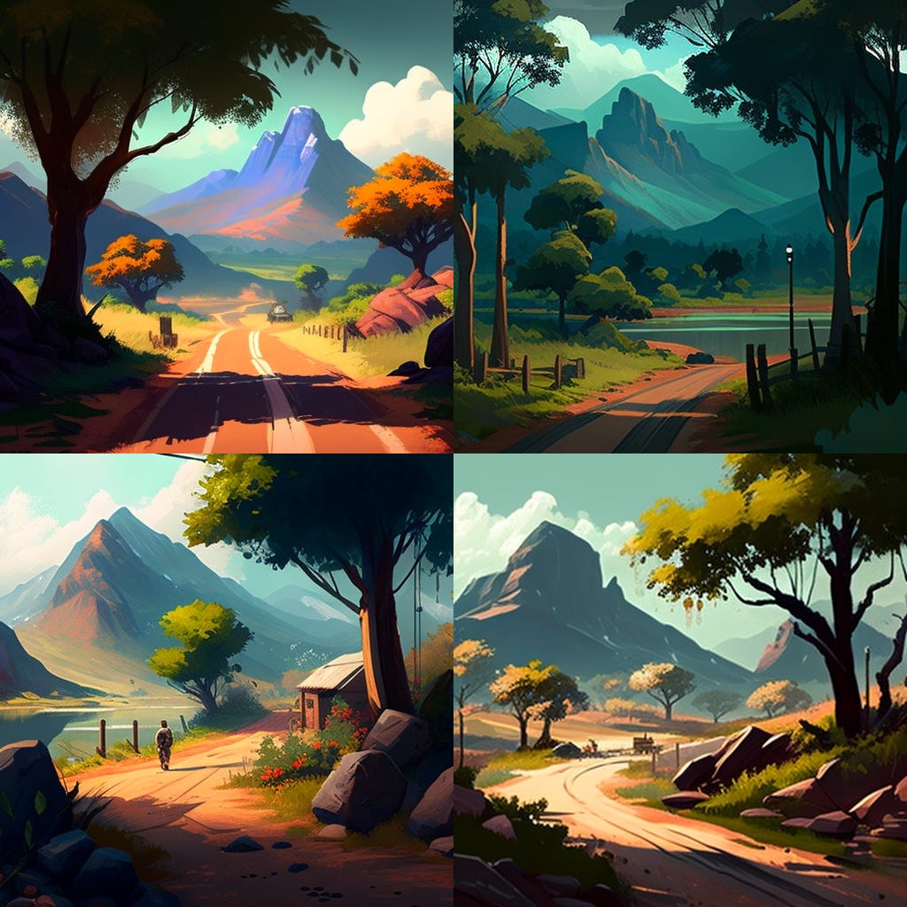 Prompt: Country road in Tamilnadu with mountains in the back ground with some villager. Animated like Pixar.